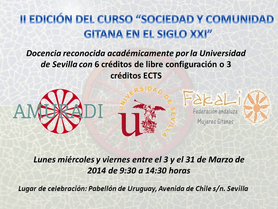 Esta iniciativa, nacida del compromiso de difundir una imagen digna de la Comunidad Gitana, queda concretada por segundo año consecutivo en el curso “Sociedad y Comunidad Gitana en el Siglo XXI”. Docencia reconocida académicamente por la Universidad de Sevilla a través de su Oficina del Voluntariado dentro del Plan de Formación del Voluntariado de la Universidad.
