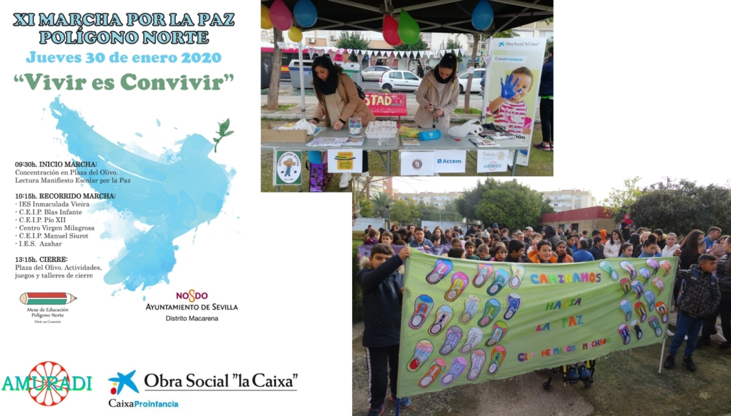 Tremendamente satisfechas y orgullosas del éxito de la XI Marcha por la Paz del Polígono Norte en Sevilla, en la que FAKALI y AMURADI han participado de manera directa como integrantes de la Mesa de Educación de Polígono Norte. Entidad organizadora que aglutina a un buen número de centros educativos, administraciones públicas, AMPAS, entidades sociales y vencidario de este barrio con necesidades de transformación social.