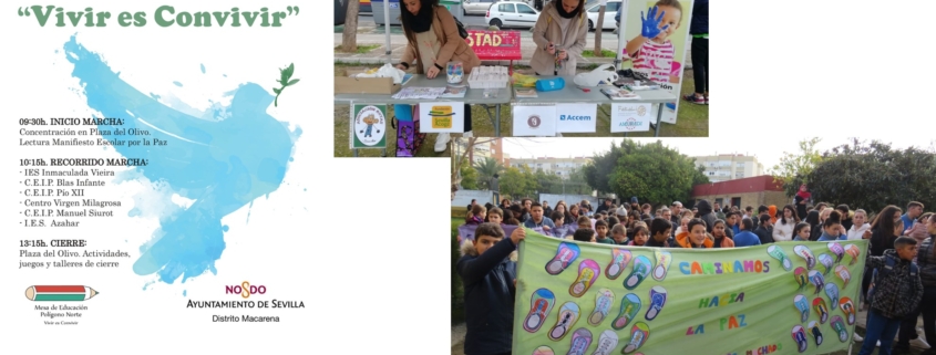 Bajo el lema "Vivir es convivir", más de 400 escolares de siete centros educativos de la zona han protagonizado este año una iniciativa que por vez primera ha contado con la presencia de representantes municipales, en este caso la delegada de Educación del Ayuntamiento de Sevilla, María Luisa Gómez Castaño y la delegada del Distrito Macarena, Clara Macías, quienes intervinieron en la lectura del manifiesto por la paz en una concurrida Plaza del Olivo. "Lanzamos un mensaje de solidaridad y de esperanza, de que es posible un futuro mejor en los barrios con el compromiso de todos con principios como la tolerancia o el respeto a la diversidad", fue la proclama de las protagonistas ante un público entregado a las actividades propuestas por la organización (talleres sociocomunitarios, música…) en una jornada que transcurrió con absoluta normalidad en un ambiente festivo y, como no, reivindicativo.